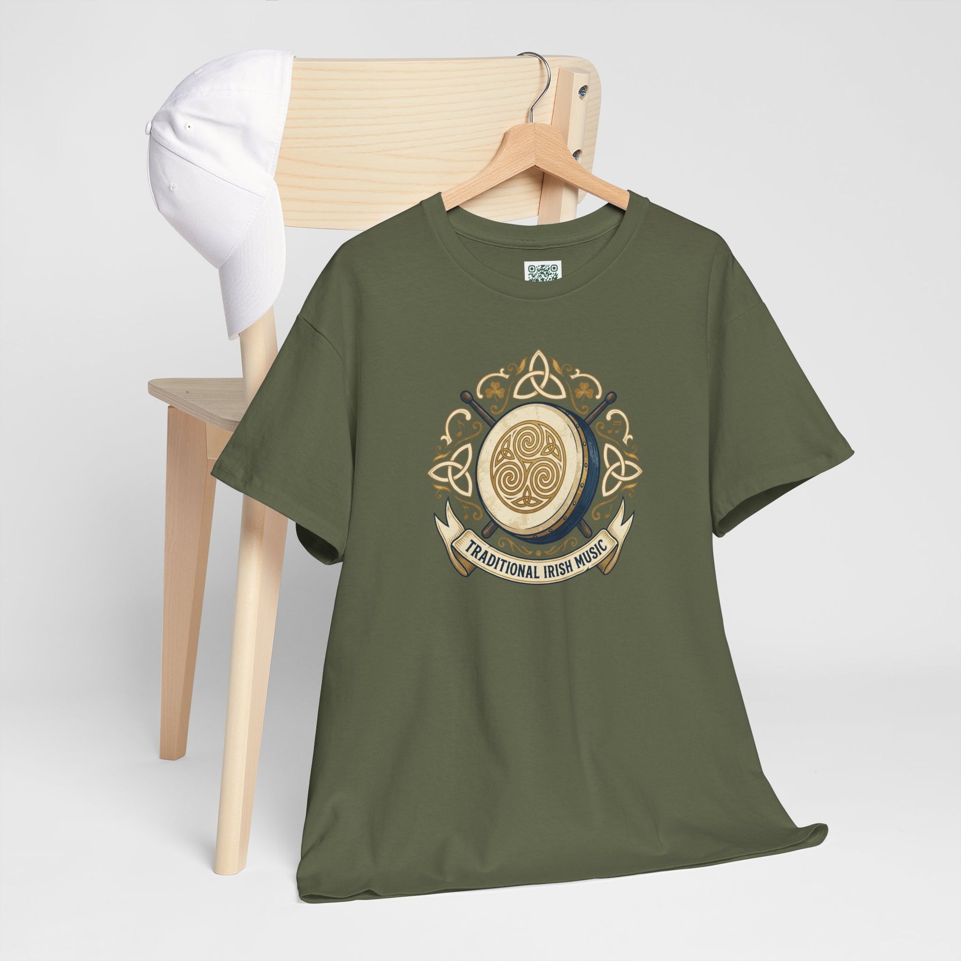 This tee carries a quiet, heritage energy, the kind you feel stepping into a dim pub with stories in the woodwork. A warm, antique-gold emblem centers the chest: Celtic knots, a detailed bodhrán and a ribboned motto that reads “Traditional Irish Music.” Small, scripted text rests high across the back yoke for a subtle, lived-in look. The design reads like an heirloom without feeling precious, worn with a jacket for the evening or paired with faded denim for a weekend ramble. It suits someone who love Irish music. Let it be the shirt you choose when you want style with quiet meaning on St. Patrick’s gatherings, family reunions, or when you’re tracing your own roots. Personalize the back with your favorite Irish song, instrument of choice, name of your favorite band or enter BLANK to leave the back of the shirt plain. If no personalization added, shirt will come as shown.